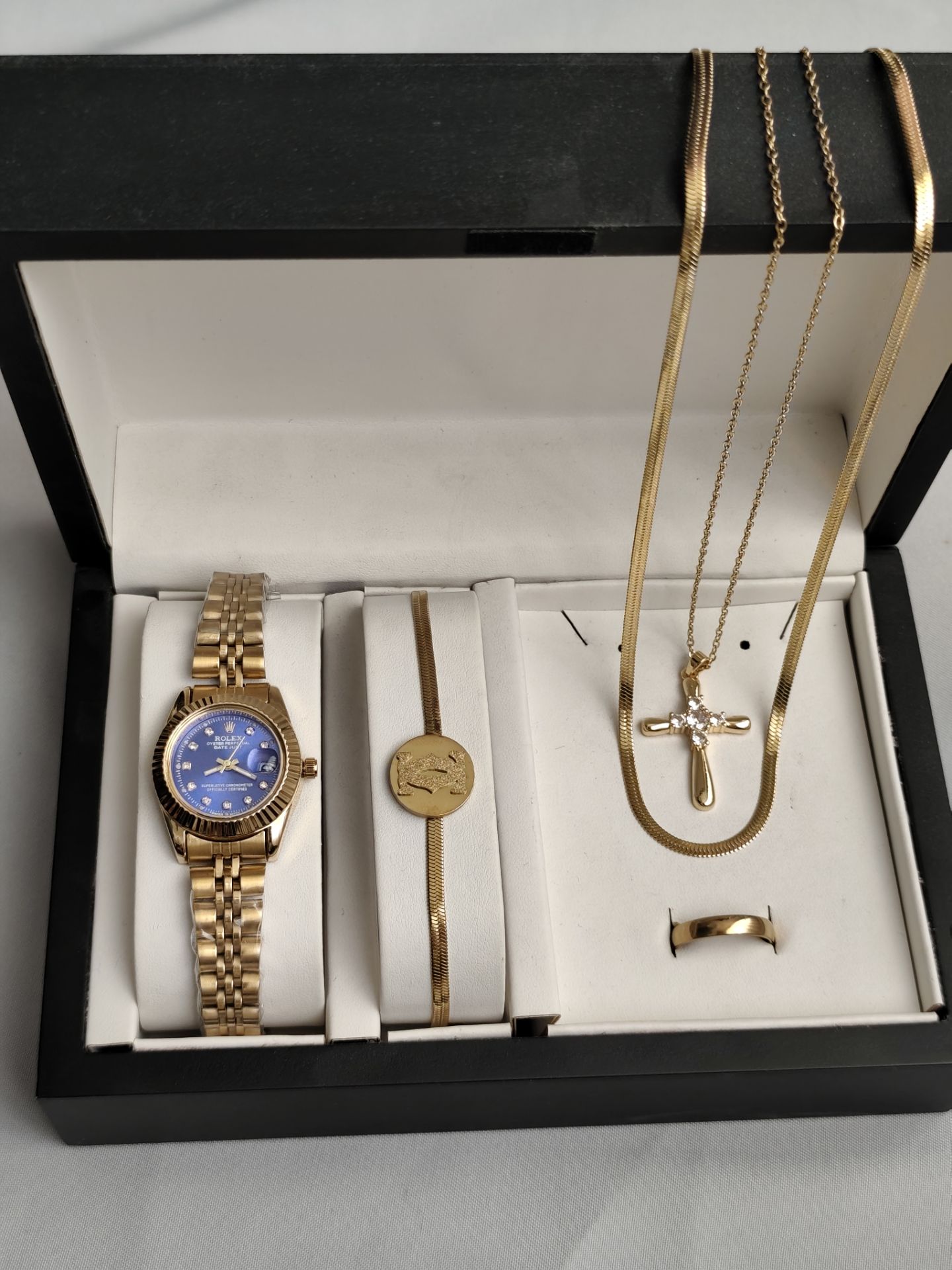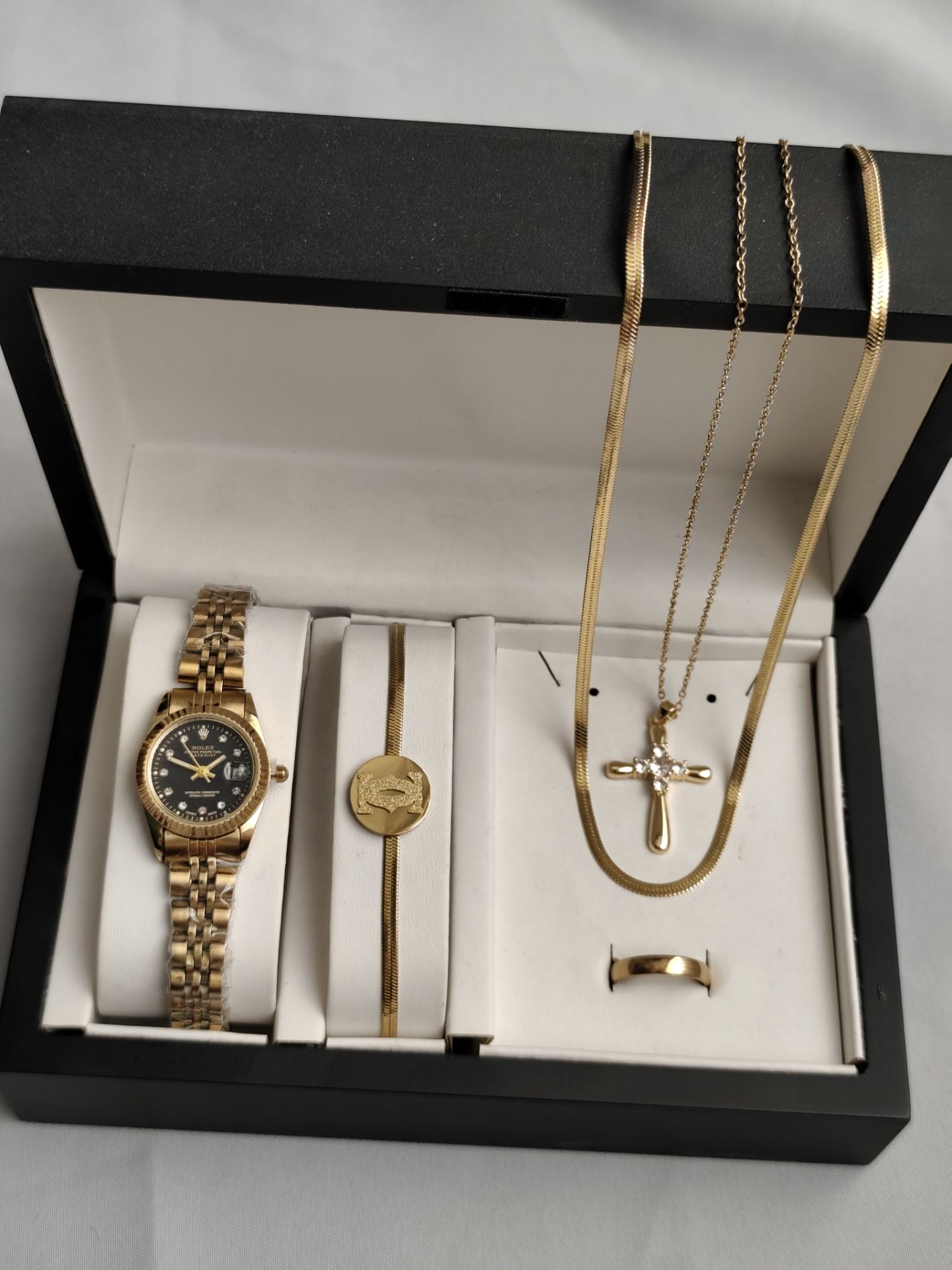 ست مردانه ساعت رولکس و دستبند و گردنبند زنجیر استیل و حلقه استیل( سایز ۶ تا ۱۰) بهمراه جعبه کادویی و باتری یدکی