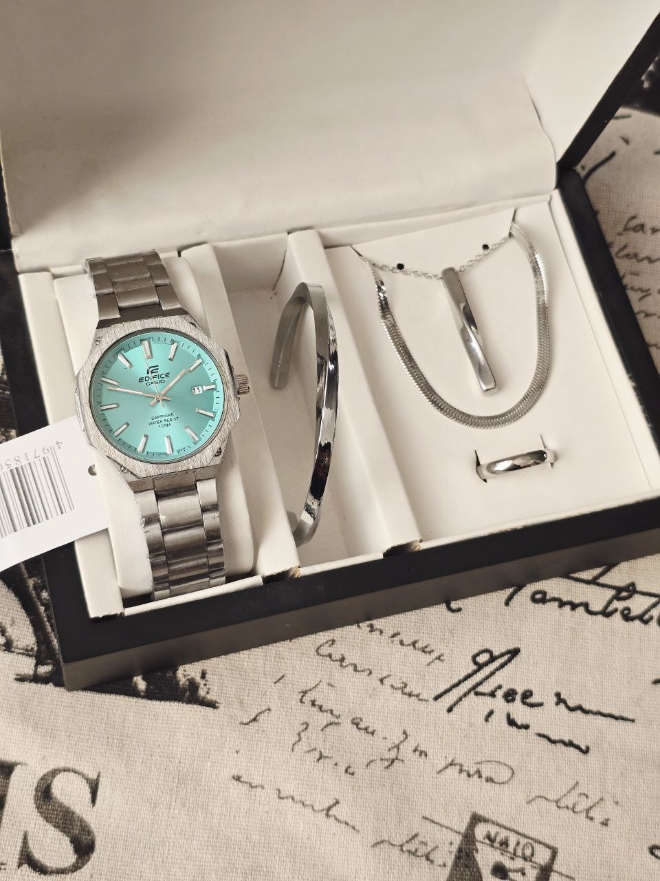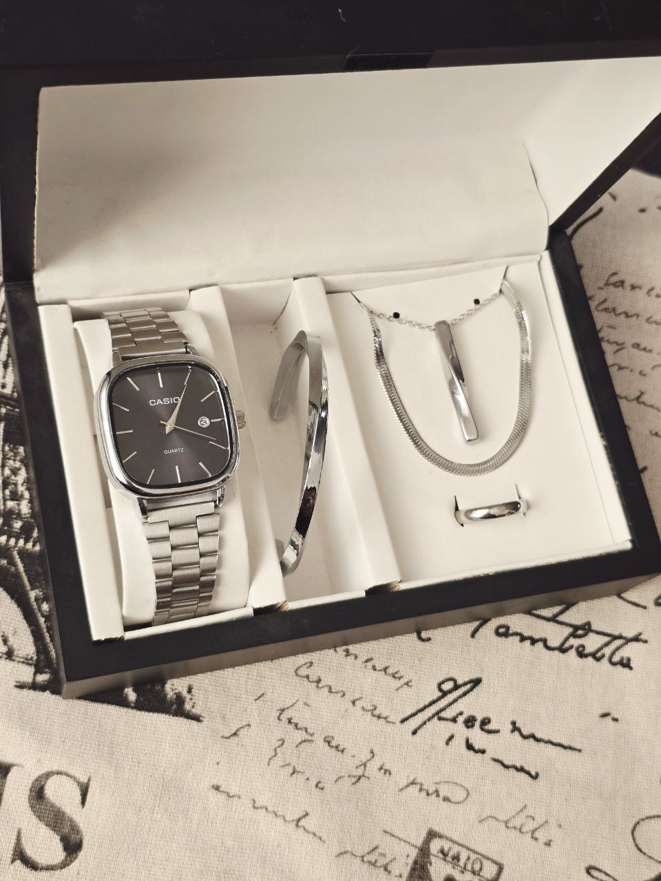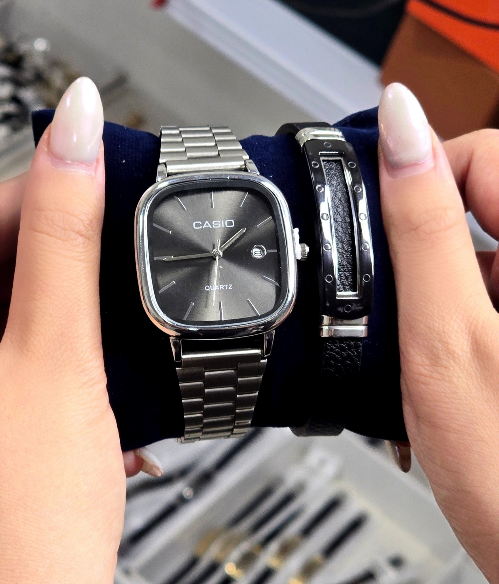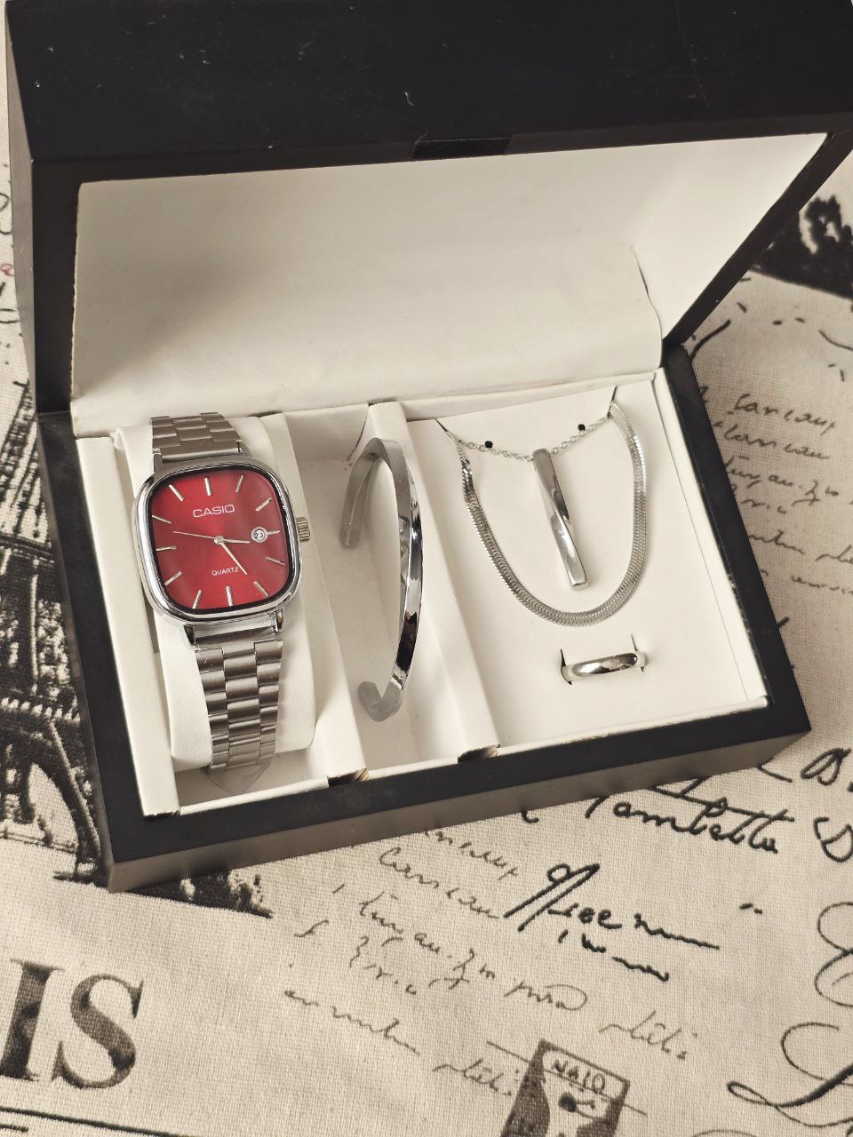 ست مردانه ساعت کاسیو مردانه تقویم فعال و بنگل و گردنبند و حلقه بهمراه جعبه کادویی و باتری یدکی