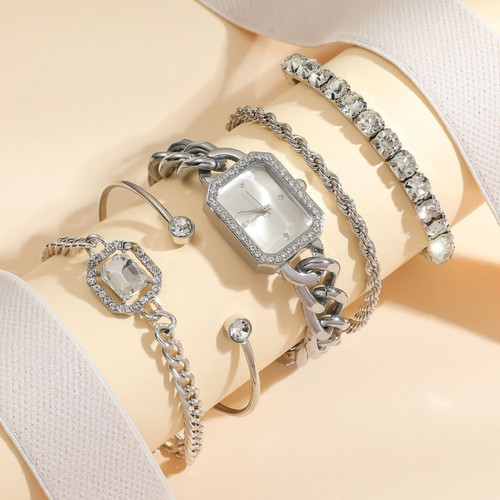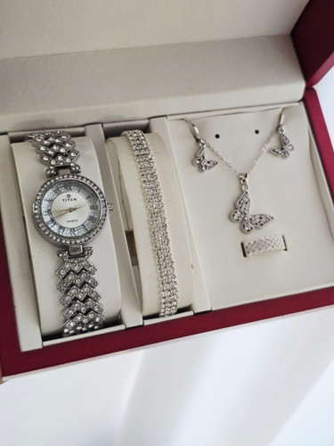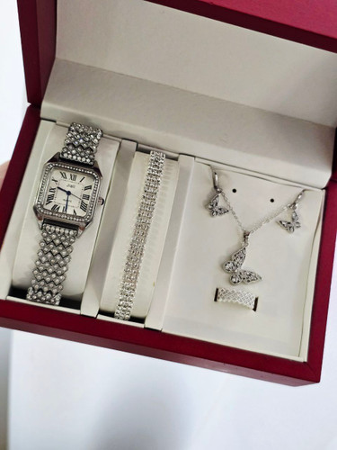 ست مجلسی زنانه و دخترانه ساعت و دستبند و نیمست و انگشتر بهمراه جعبه کادویی و باتری یدکی