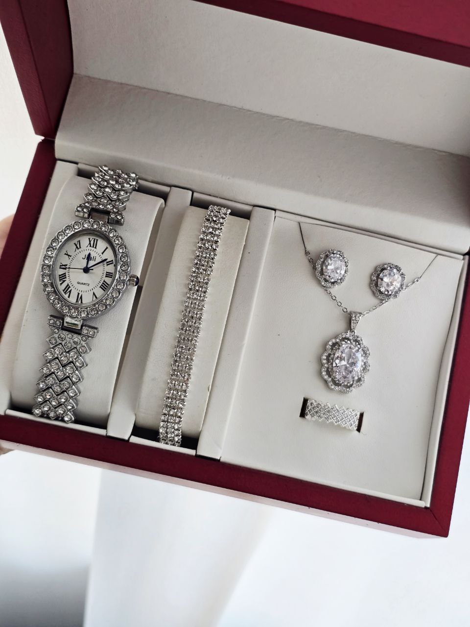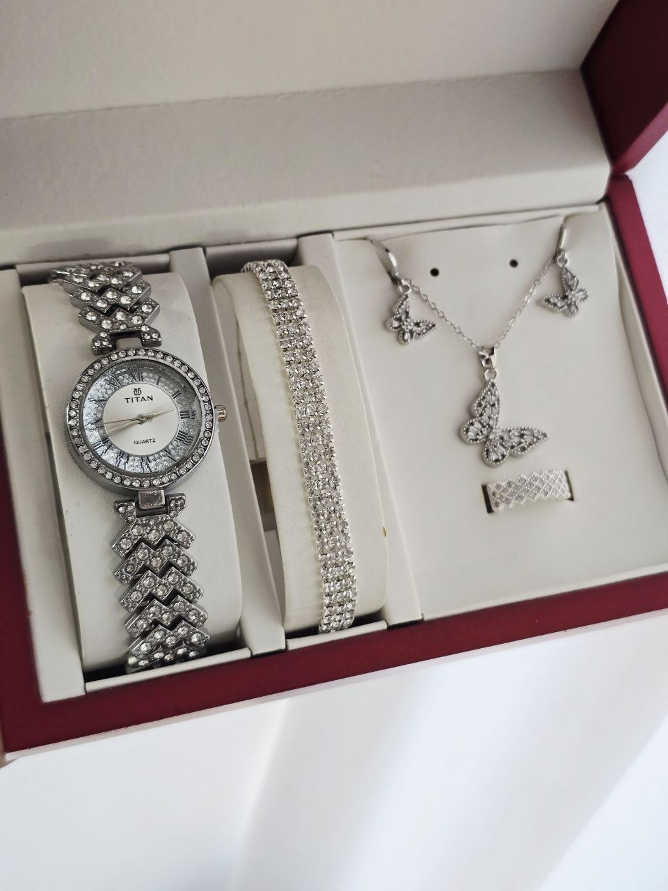 ست مجلسی زنانه و دخترانه ساعت و دستبند و نیمست و انگشتر بهمراه جعبه کادویی و باتری یدکی