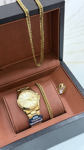 ست مردانه ساعت کاسیو مردانه تقویم فعال و بنگل و گردنبند و حلقه بهمراه جعبه کادویی و باتری یدکی