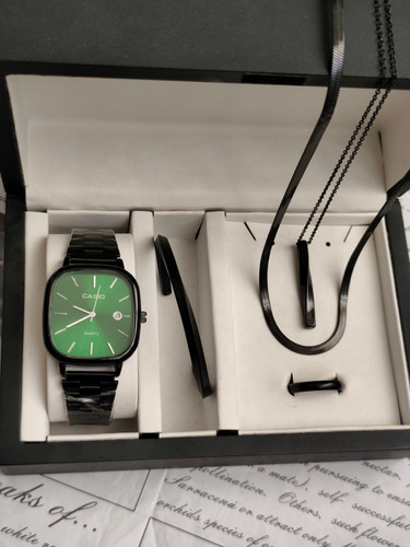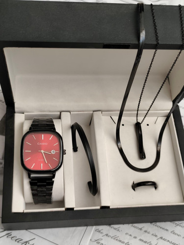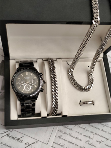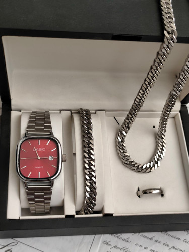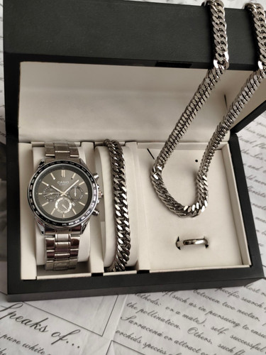 ست مردانه ساعت کاسیو تقویم فعال و بنگل و گردنبند و حلقه بهمراه جعبه کادویی و باتری یدکی