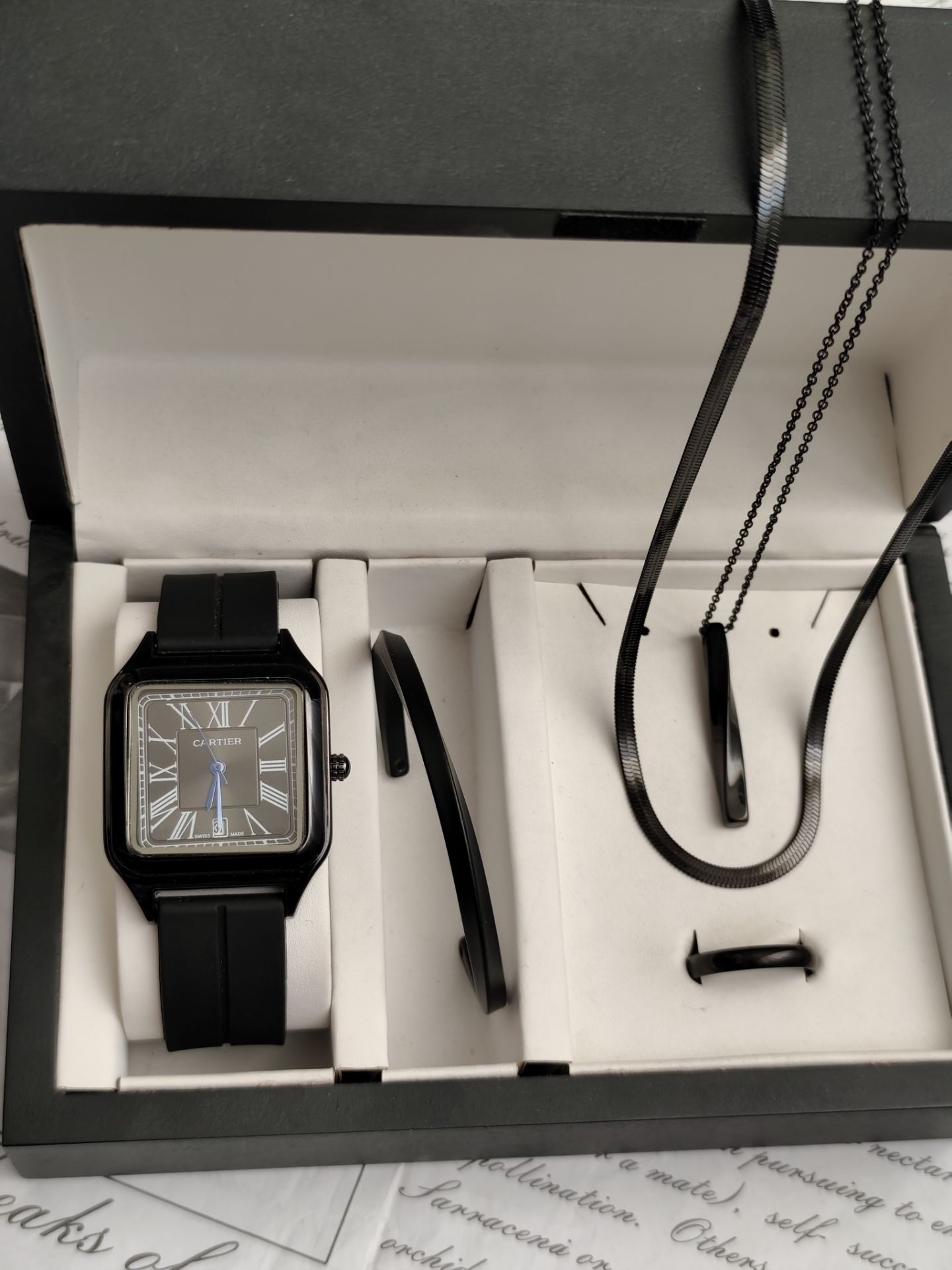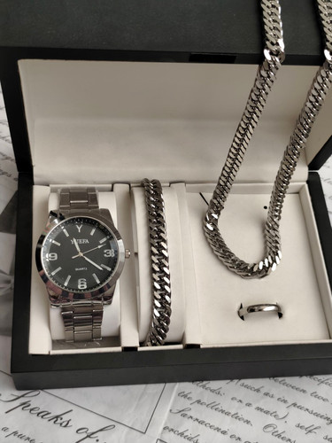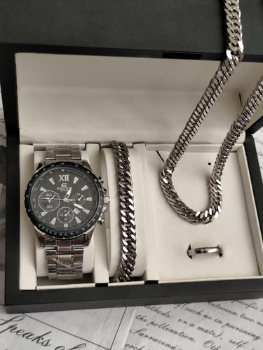 ست مردانه ساعت و بنگل و گردنبند و حلقه بهمراه جعبه کادویی و باتری یدکی
