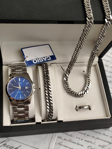 ست مردانه ساعت کاسیو مردانه تقویم فعال و بنگل و گردنبند و حلقه بهمراه جعبه کادویی و باتری یدکی