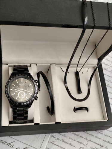 ست مردانه ساعت کاسیو تقویم دار بهمراه زیورآلات جعبه کادویی و باتری یدکی