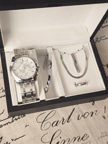 ست مردانه ساعت تیسوت مردانه تقویم فعال و بنگل و گردنبند و حلقه بهمراه جعبه کادویی و باتری یدکی