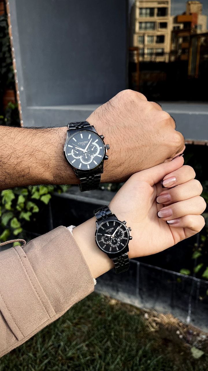 ست ساعت زنانه و مردانه برند الگانس کیفیت عالی شیک و جذاب موتور درجه یک طرح سه موتوره دارای تقویم روزشمار قاب و بند تمام استیل قفل کلیپسی استیل ضامن دار