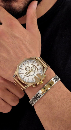 ست مردانه ساعت و دستبند و گردنبند و انگشتر ساعت دیزل دارای روزشمار بهمراه گردنبند و دستبند استیل و طلایی و جعبه کادویی و باتری یدکی