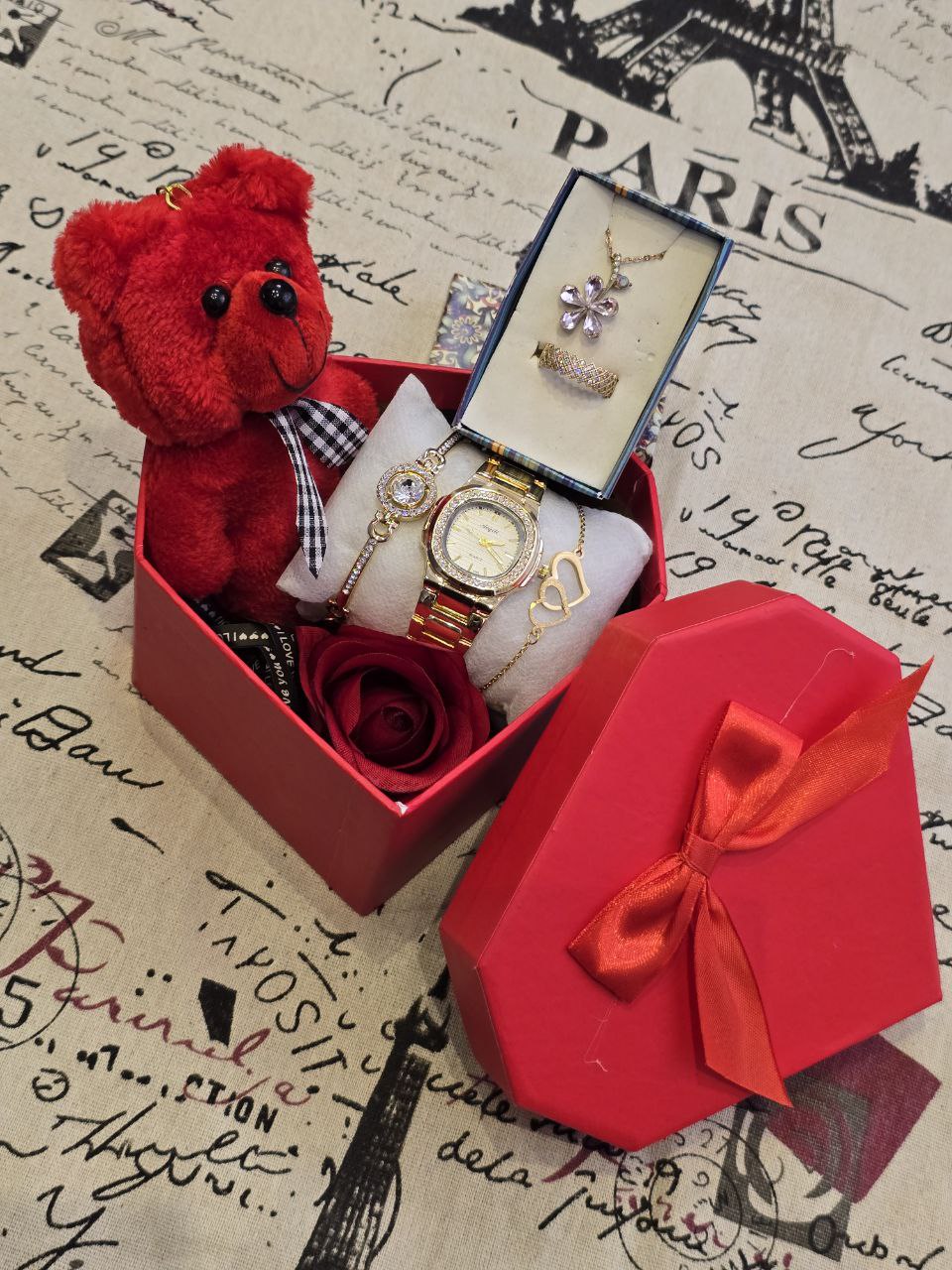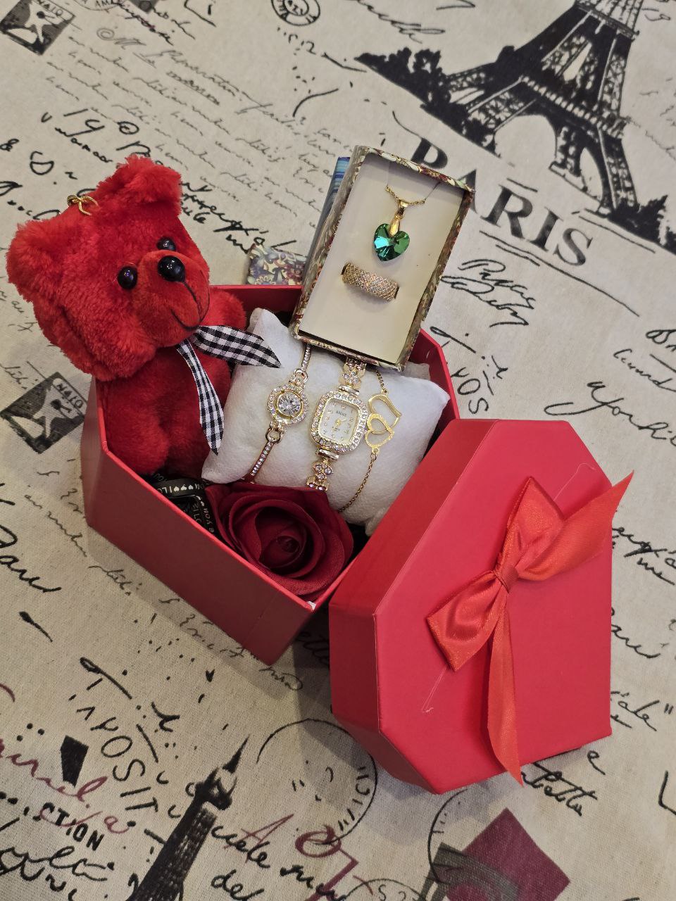 پک زنانه و دخترانه ساعت  و دستبند و گردنبند و انگشتر بهمراه باکس و گل مصنوعی