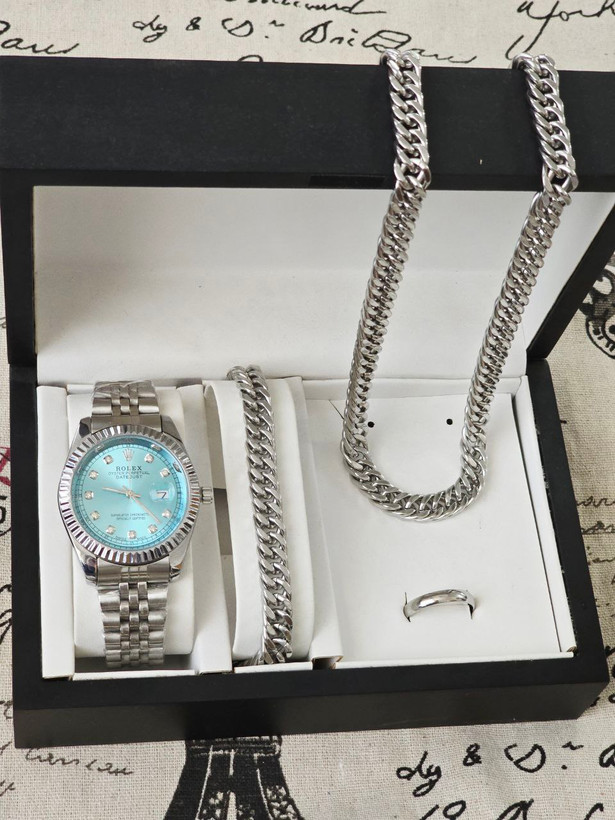 مشخصات محصولست مردانه ساعت رولکس صفحه تیفانی و دستبند و گردنبند زنجیر استیل و حلقه استیل( سایز ۶ تا ۱۰) بهمراه جعبه کادویی و باتری یدکی