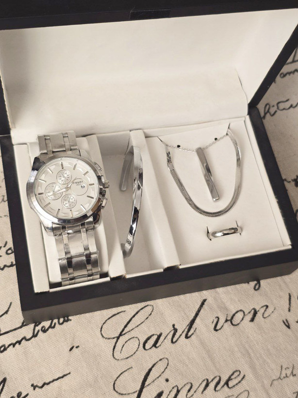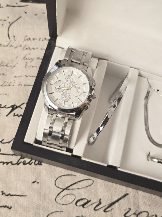 ست مردانه ساعت تیسوت مردانه تقویم فعال و بنگل و  گردنبند و حلقه بهمراه جعبه کادویی و باتری یدکی
