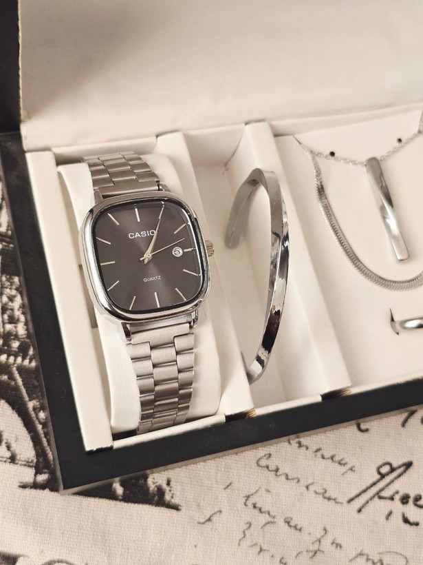 ست مردانه ساعت کاسیو مردانه تقویم فعال و بنگل و  گردنبند و حلقه بهمراه جعبه کادویی و باتری یدکی