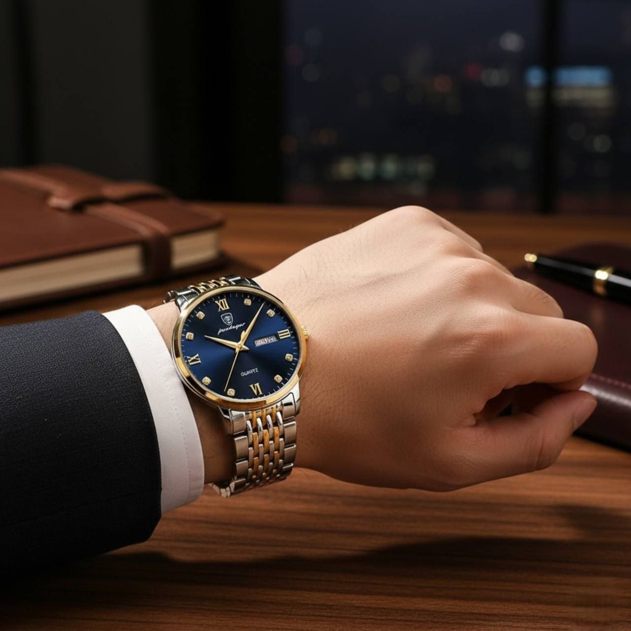مشخصات محصولمردانه پر طرفدار از برند پوداگار❤️🔥 کار اورجینال از برند پوداگار📌 برند: poedagar مدل: 856 در دو رنگ صفحه مشکی و سورمه ای تاریخ دار(ایام هفته و ماه) تمام استیل بند سیلور طلایی موتور کوارتز قفل کلیپسی اعداد نگین دار قطر صفحه ۴۲ میل ضد اب (شست و شوی دست)