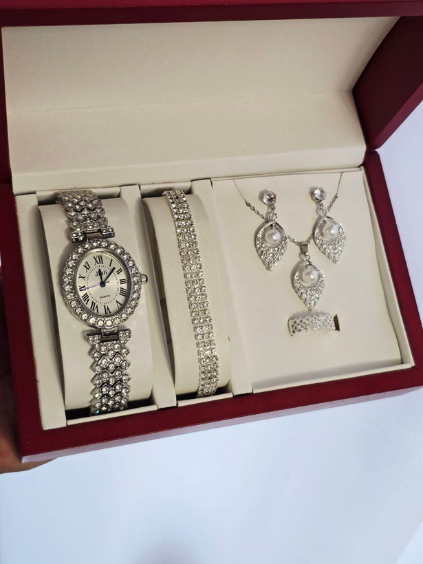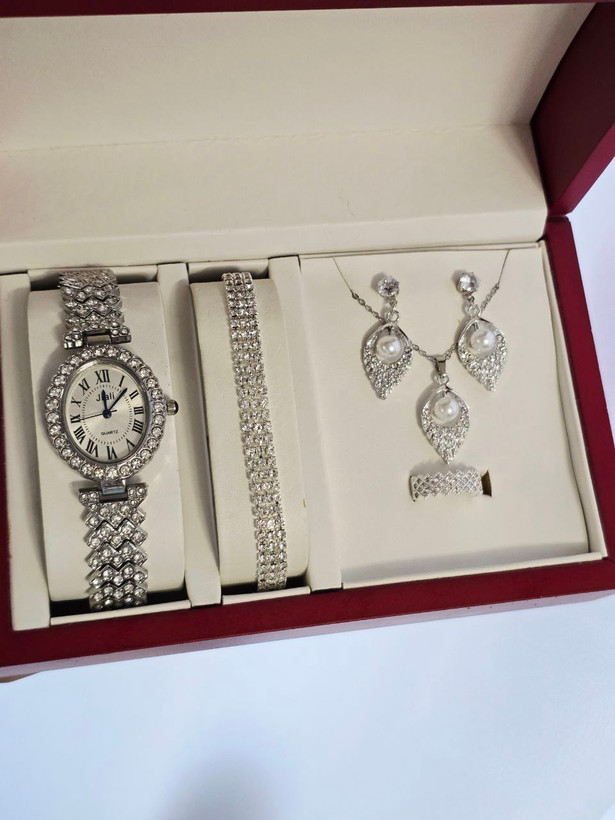 مشخصات محصولست مجلسی زنانه و دخترانه ساعت و دستبند و نیمست و انگشتر بهمراه جعبه کادویی و باتری یدکی