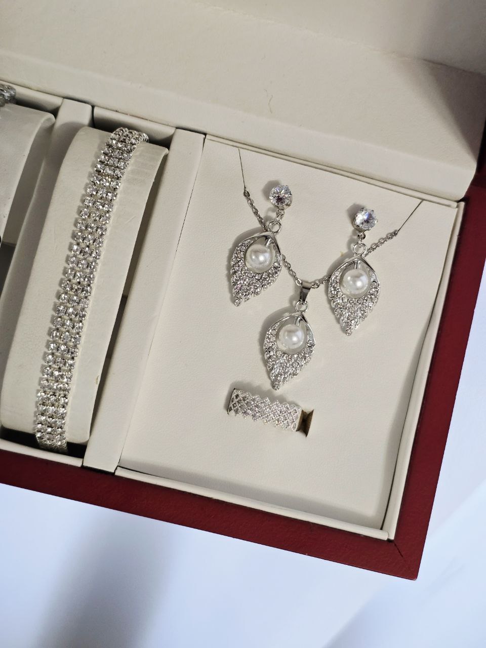مشخصات محصول: ست مجلسی زنانه و دخترانه ساعت و دستبند و نیمست و انگشتر بهمراه جعبه کادویی و باتری یدکی