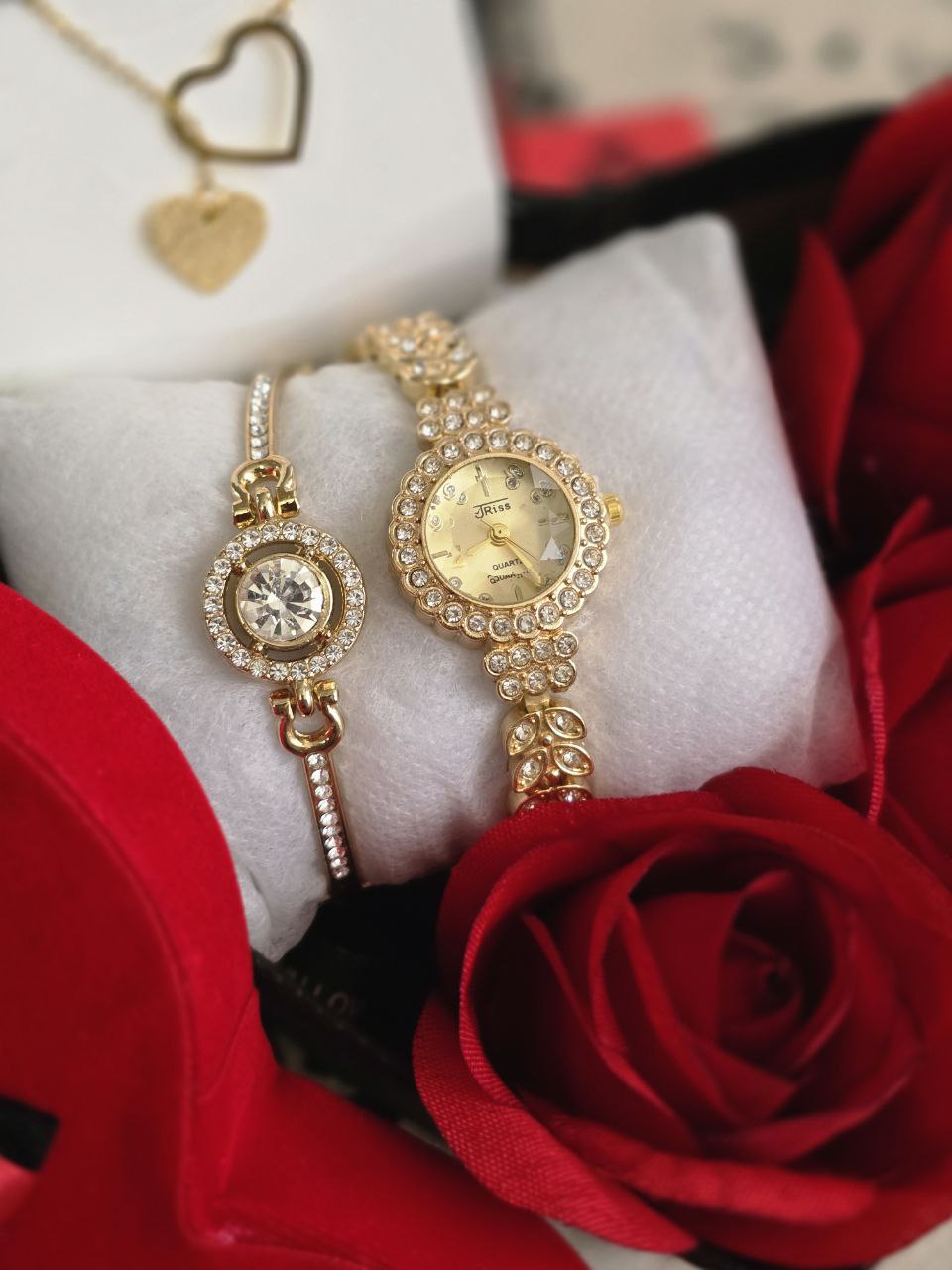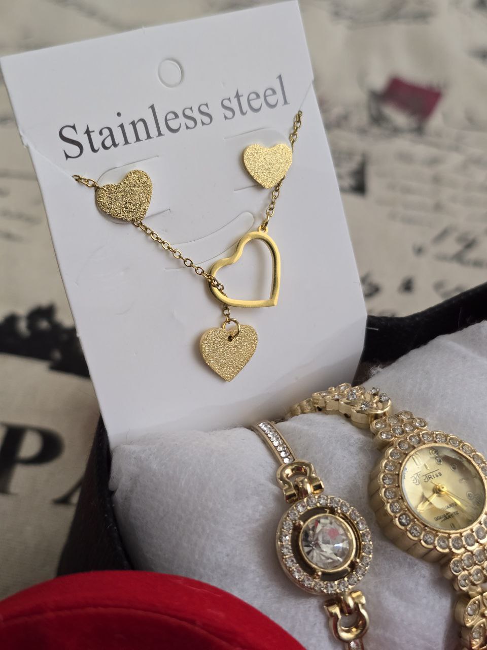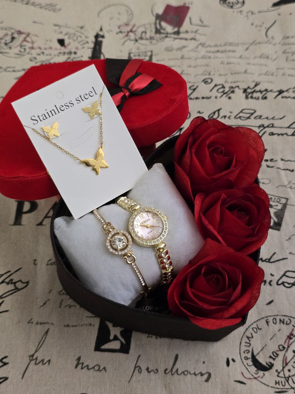 باکس هدیه زنانه و دخترانه ساعت و دستبند و نیمست استیل طلایی رنگ ثابت و باکس و گل