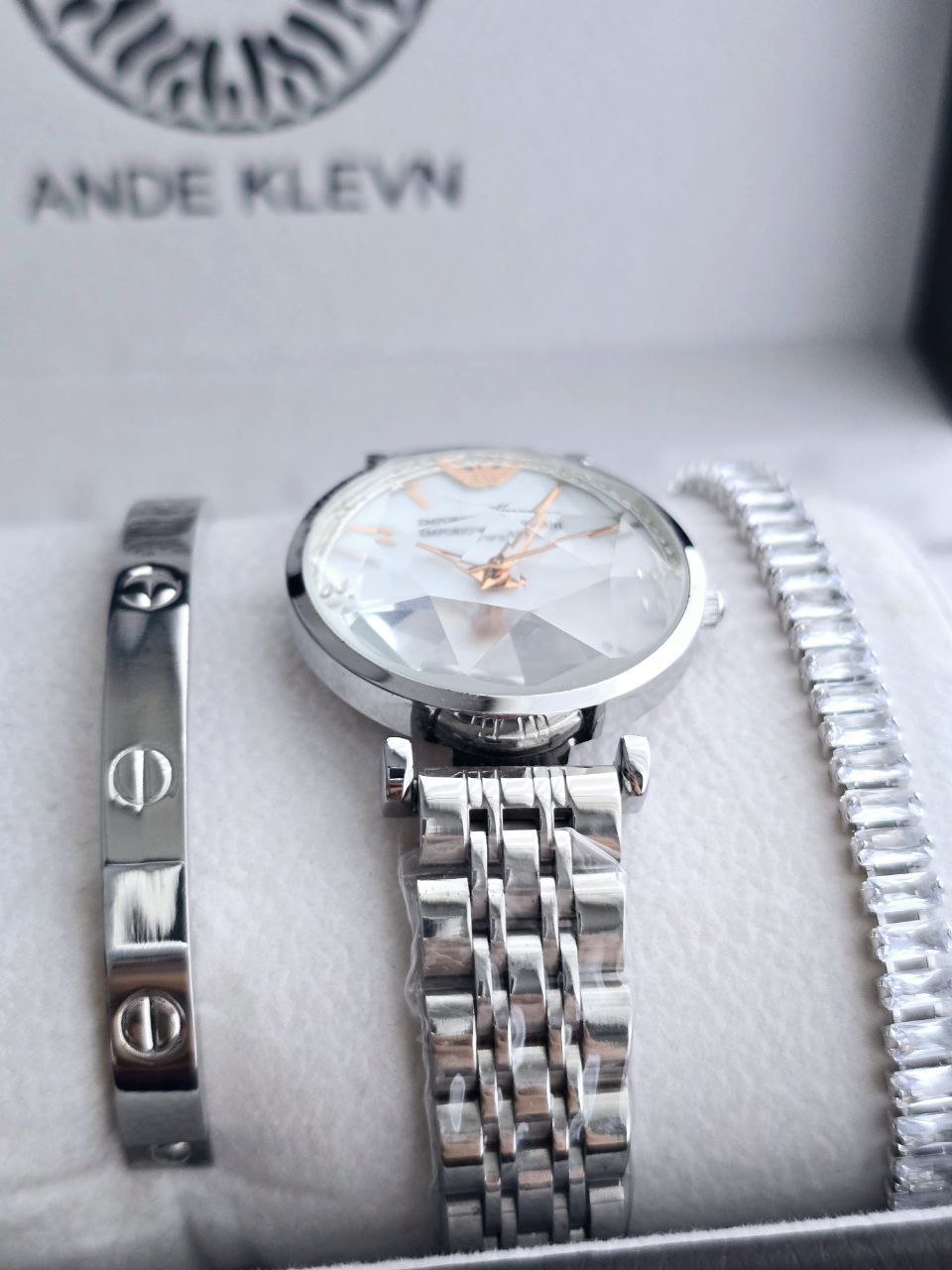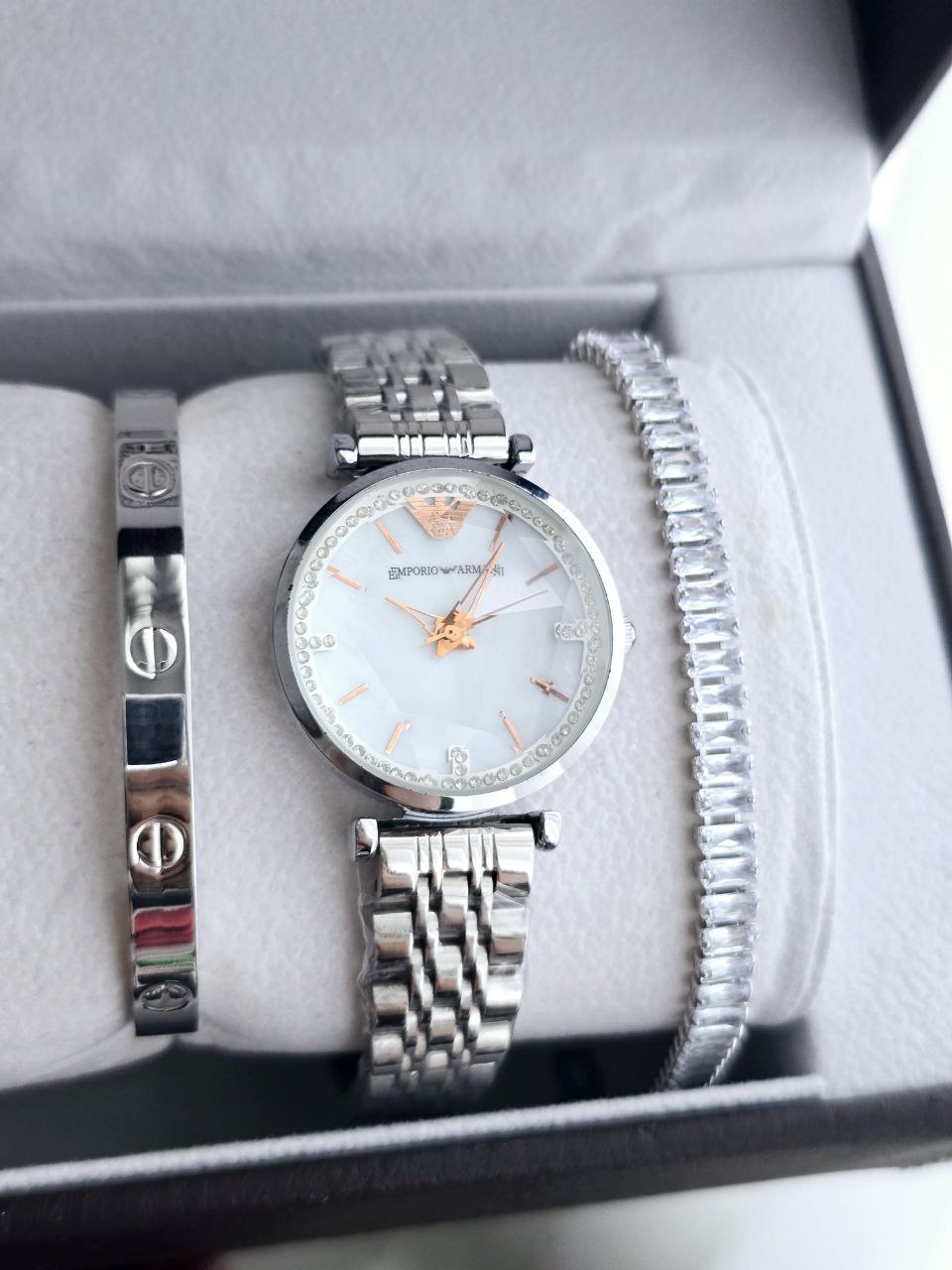 ساعت زنانه برند آرمانی بند استیل قفل پروانه ای بهمراه النگو کارتیر و دستبند فول نگین و جعبه و باتری یدکی