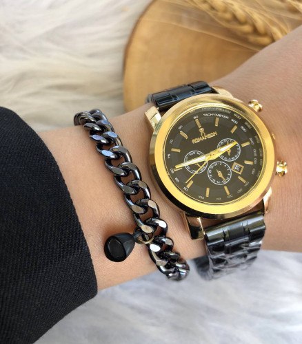 ست خاص و شیک رومانسون زنانه | بند استیل مشکی صفحه مشکی، قاب طلایی + همراه با دستبند زنجیری مشکی شناسه: #369197