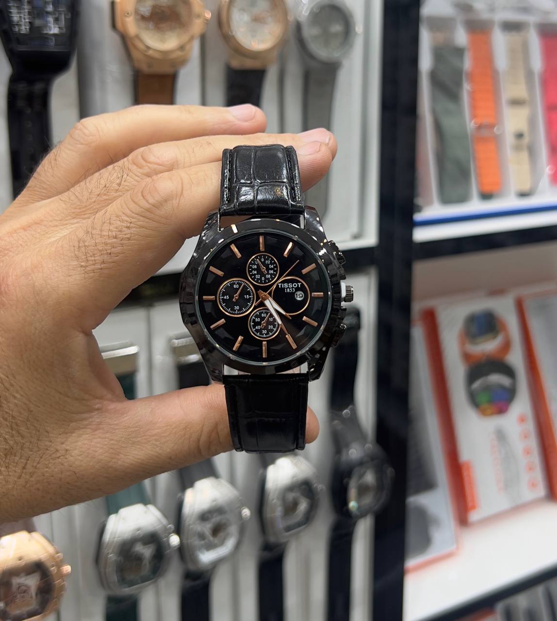 TISSOT 1853 ساعت تیسوت مردانه بند چرمی دور دوز قاب فلزی مشکی طرح سه موتوره تقویم فعال