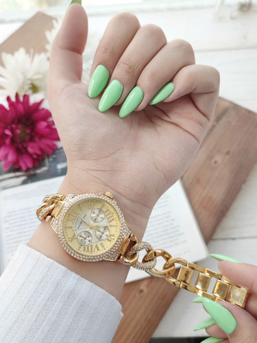 ساعت مارک جم استار GEMSTAR (طلایی) 7508001924 قفل ضامن دار دارای روز شمار موتور با کیفیت قاب و بند استیل کیفیت بسیار خوب حک مارک روی قفل همراه با جعبه شیک