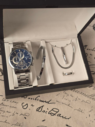 ست مردانه ساعت و بنگل و گردنبند و حلقه بهمراه جعبه کادویی و باتری یدکی