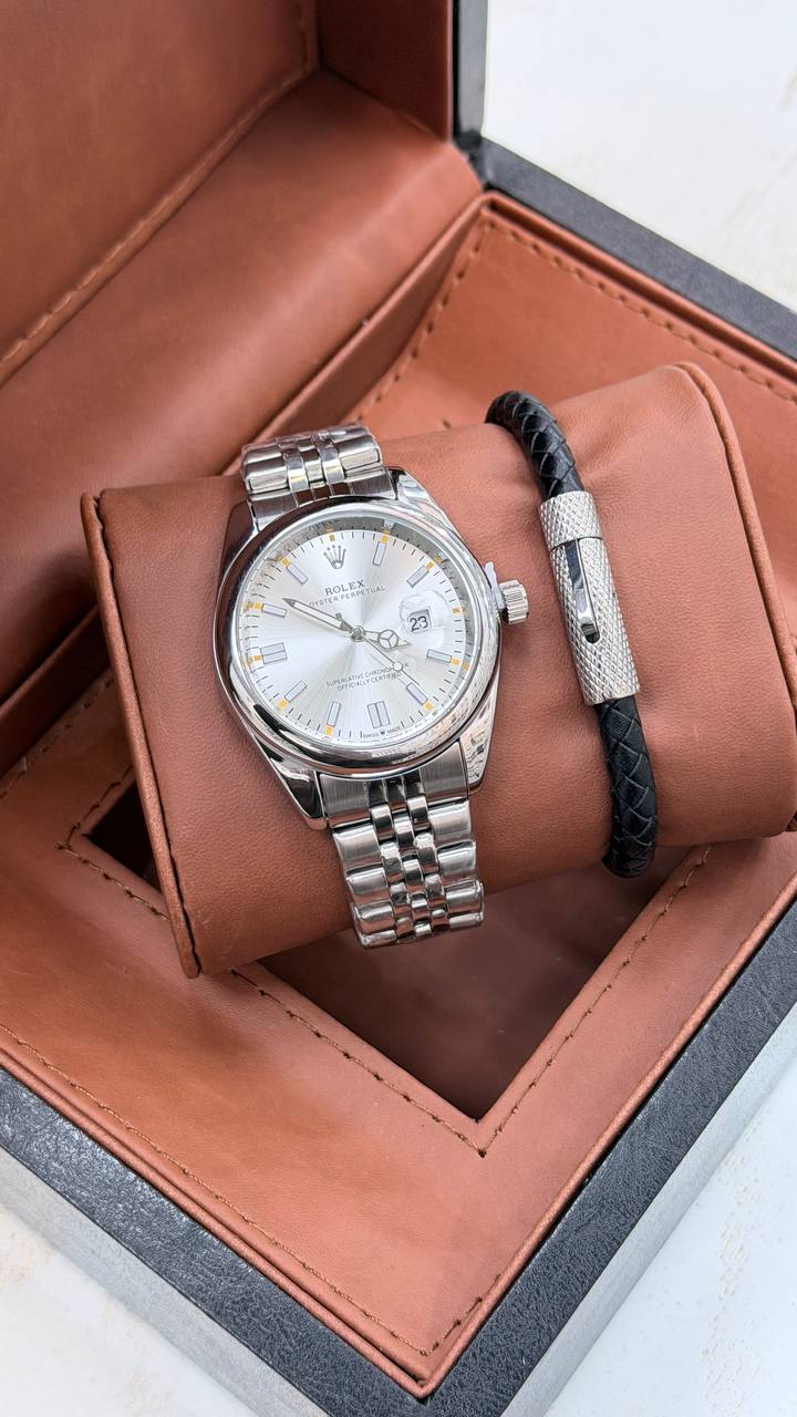 ست مردانه ساعت رولکس و دستبند و گردنبند زنجیر استیل و حلقه استیل( سایز ۶ تا ۱۰) بهمراه جعبه کادویی و باتری یدکی