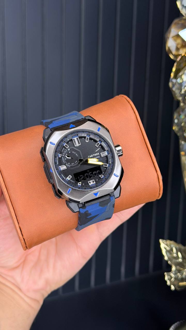 جی شاک دو زمانه pro trek انالوگ و دیجیتالی دارای ساعت عقربه و دیجیتالی کرنومتر تاریخ روز شمار ایام هفته لایت و آلارم