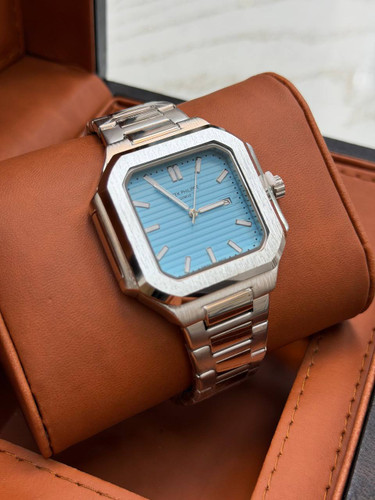 ساعت بند پیو مارک کارتیر CARTIER 3804506 تقویم دار قاب استیل بند پیو نرم موتور با کیفیت دارای اعداد یونانی کیفیت بسیار خوب همراه با جعبه شیک