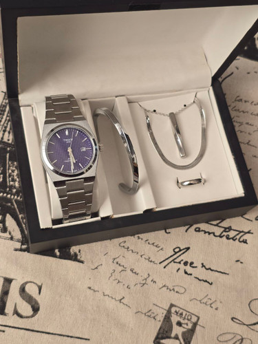 ست مردانه ساعت تیسوت مردانه تقویم فعال و بنگل و گردنبند و حلقه بهمراه جعبه کادویی و باتری یدکی